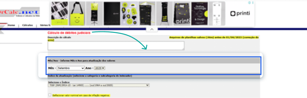 2º Passo: Com o site aberto, localize o campo “Mês/Ano - Informe Mês e Ano para atualização dos valores”