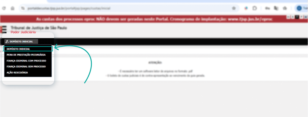 1º Passo: Acesse o portal de custas do TJSP. No site, clique em “DEPÓSITO JUDICIAL” e, novamente, em “DEPÓSITO JUDICIAL”.
