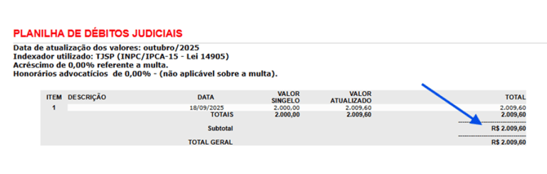 Atualizar o valor da parcela conforme o índice de correção aplicável (geralmente o TJSP – INPC/IPCA-15 – Lei 14.905);