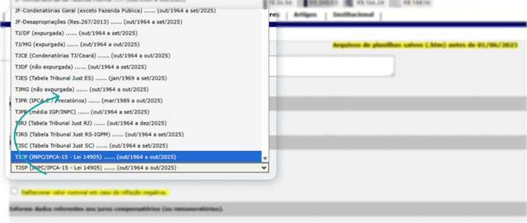 4º Passo: Com o mês vigente selecionado, no campo abaixo, escolha o índice de atualização conforme o tipo de cálculo. No caso de leilão judicial, geralmente é utilizado o índice “TJSP (INPC/IPCA-15 – Lei 14905) ...... (out/1964 a out/2025)”.